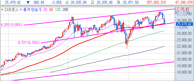 위 차트는 다우존서 주봉 차트인데 수년전부터 형성된 기술적 패턴의 갭을 채우며 마감을 하였습니다.